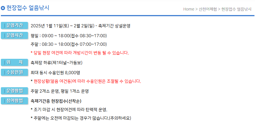 화천 산천어 축제는 매년 많은 방문객이 몰리면서 현장에서의 대기 시간이 길어지고 인기 프로그램은 조기에 마감되는 경우가 많습니다. 사전예약 없이 방문하면 원하는 체험에 참여하지 못하거나 추운 날씨 긴 대기 줄에서 소중한 시간을 허비할 가능성이 크므로, 반드시 사전예약 후 방문하시기를 추천드립니다.