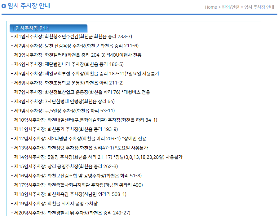 - 셔틀버스: 화천역 등 주요 지점에서 무료 셔틀 제공.(내부셔틀도 제공)