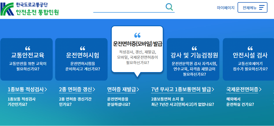 홈페이지 메인 화면에서 '운전면허증(모바일) 발급' 클릭 후 '국제운전면허증' 메뉴 선택