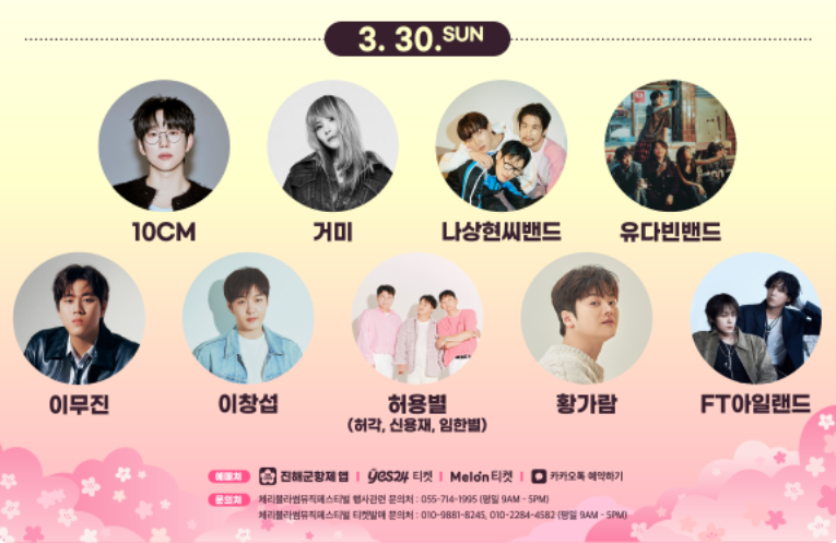 국내외 유명 아티스트들이 참여하는 콘서트로, 다양한 장르의 음악을 한자리에서 즐길 수 있습니다. 특히 벚꽃이 만개한 진해의 아름다운 풍경과 함께하는 공연은 특별한 감동을 선사할 것입니다.