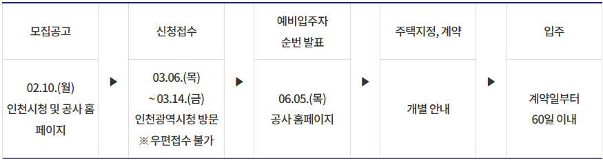 신청 일정은 매년 다를 수 있으므로 인천시청 또는 인천도시공사 홈페이지를 통해 최신 공고를 확인하시기 바랍니다.